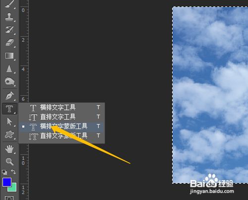 4、4.单击东西箱中选横排文字蒙版东西,图片中输入文字。