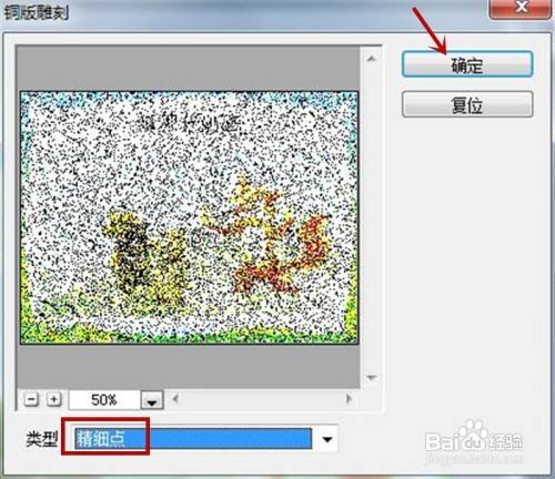 5、弹出"铜版雕镂"功能界面,鄙人面的类型选项选中"邃密点",然后点击"确定"按钮