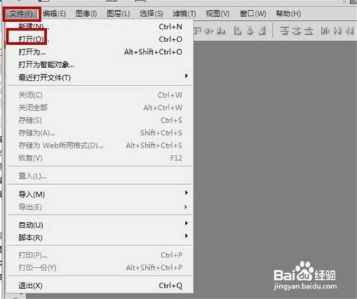 1、打开PhotoshopCS5软件界面,鼠标单击"文件"选项卡,在弹出的列表中点击"打开"号令