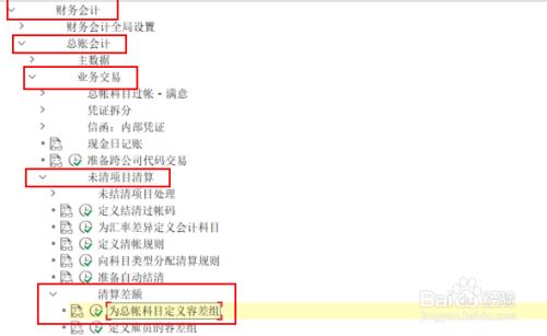 点击'财政管帐',睁开子项,选择'总账管帐' —> '营业买卖' —>'未清项目清理' —> '清理差额' —> '为总账科目界说容差组' ,并点击执行