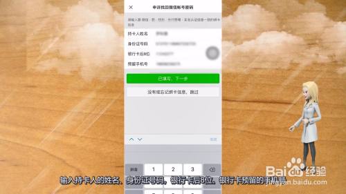 在页面里输入微信实名认证信息一致的绑卡信息,输入持卡人的姓名、身份证号码,银行卡后8位、银行卡预留的手机号,填写好之后点击下一步按钮。