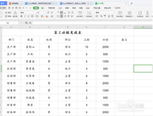 打开一个已有的Excel表格,下面是某公司关于补助发放的相关记实: