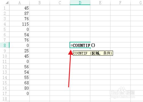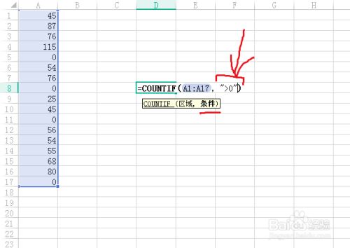 =COUNTIF(A1:A17,)输入完区域跋文得加上一个逗号才能进入前提。