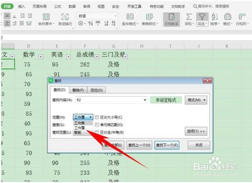 单击选项,在查找内容处输入92,若是想要扩大搜刮规模,可以在规模的下拉菜单下,选择工作簿,单击查找全数。