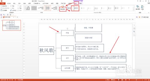 选择二级分支文本框——设计——添加外形——在后面添加外形——输入四个二级分支内容:作者、原文、译文、创作布景。