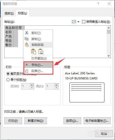 设置完当作后,点击“确定”按钮,返回“信封和标签”对话框中,在“地址”文本框中输入标签内容。然后选中文字,点击鼠标右键,在弹出的快捷菜单中选择“字体”或“段落”号令,这里我们选择“字体”号令。