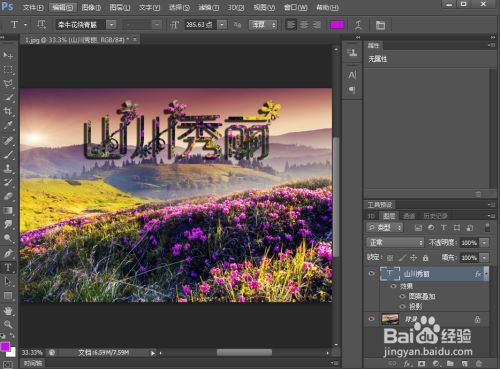 点击文字东西,选择紫色,输入山水秀丽;