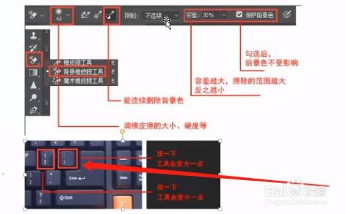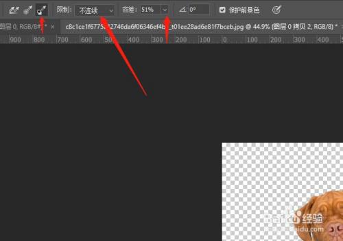 布景色选项图片上的布景颜色,限制选为不持续,容差50%摆布,在图片上起头涂抹布景,如图。