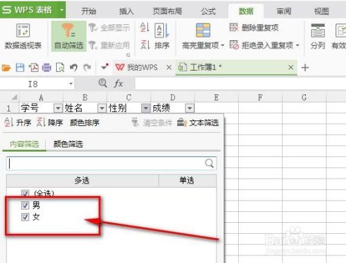 点击性别一列的三角图标,然后把“男”前面的勾去失落,点击确定。