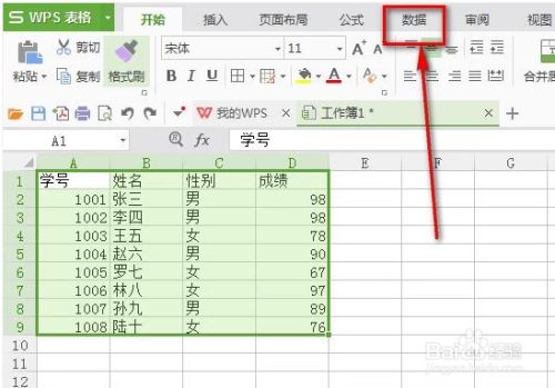 选中数据之后,点击WPS表格菜单栏的“数据”菜单。