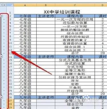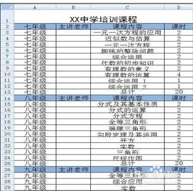 我们需要先打开一个表格,我们看到里面有七、八、九三个年级的培训课程。若是我们每次只想看到一个年级的培训课程,怎么设置呢?