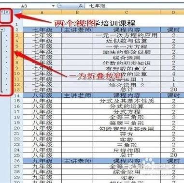 这时您会看到在表格的左侧呈现了1、2两个视图。点击1可以将七年级部门折叠起来。点击2,可以看到全数内容。并且在七年级内容的左侧还呈现了折叠按钮,也可以将七年级部门折叠起来。