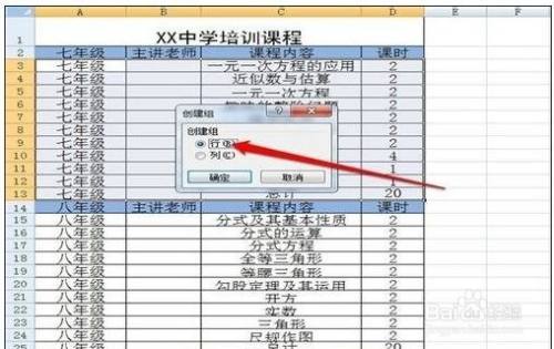 接着我们在弹出的“建立组”的对话框中将“行”选中,并确定。