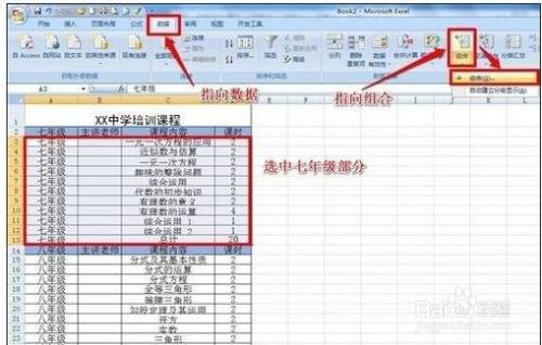 然后我们将七年级部门选中,依次执行“数据”——“组合”——“组合”。