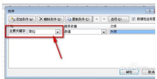 如图,点击排序菜单之后,可以看到这样窗口,我先来说说按照职位排序的。首先在本家儿要关头字这里选择“职位”