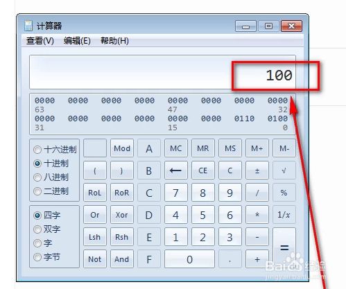 然后再去点击一下“二进制”选项,十进制数100就转换当作二进制了