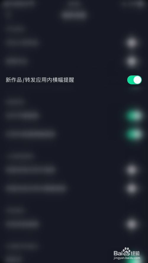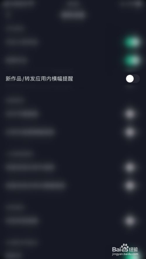 通知设置界面点击“新作品/转发应用内横幅提醒”后面的圆点