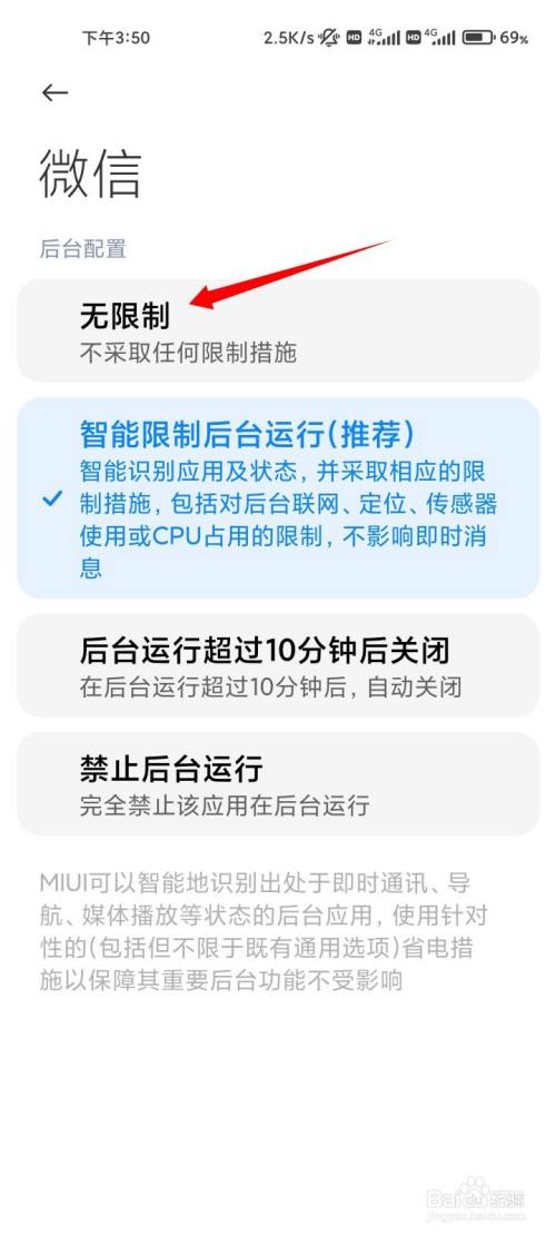 点击无限制的权限,防止微信在后台被断网。