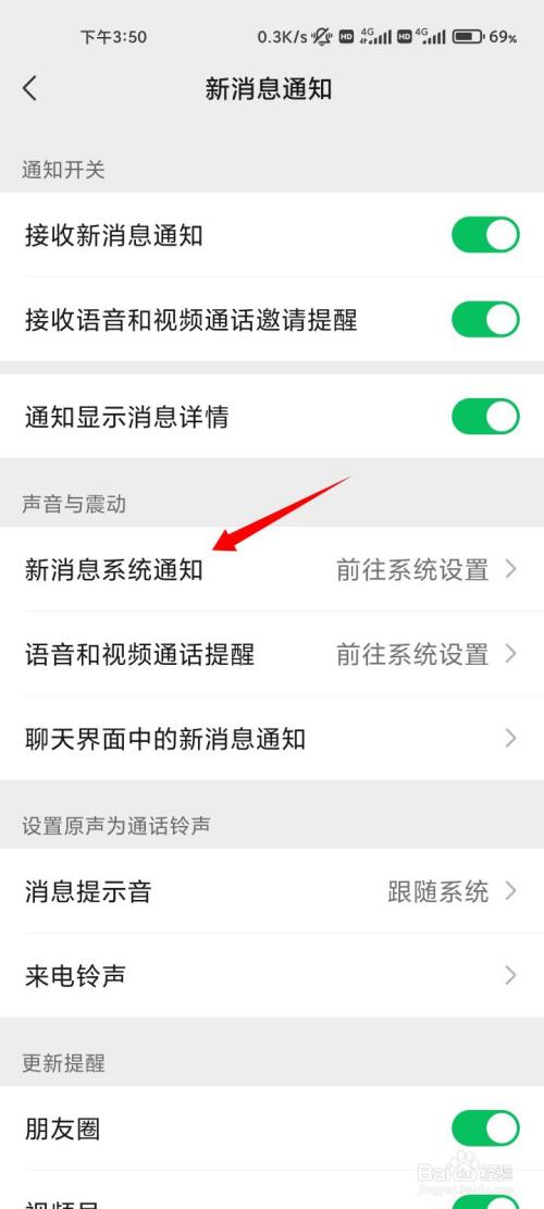 点击新动静系统通知的选项。
