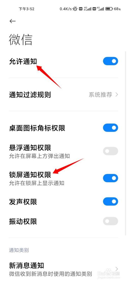 将许可通知和锁屏通知权限两个选项后面的开关全数打开即可。
