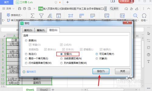 在定位窗口,点击“空值”,再点击确定。