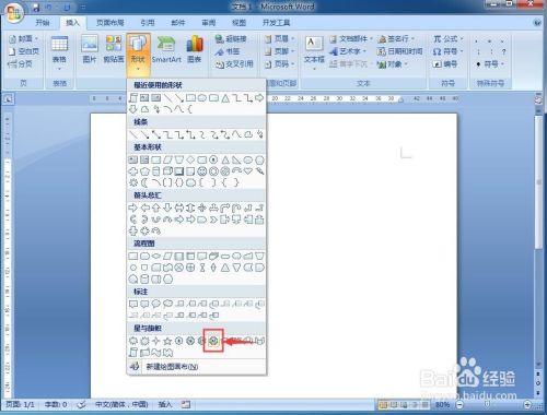 1、打开word,点击插入菜单,选择外形;