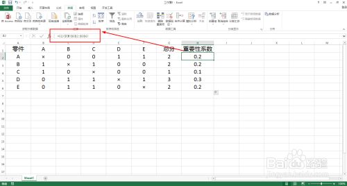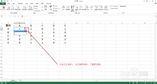 用A列零件与第一行零件对比,与本身比力就选择“×”,本身主要选择1,不主要就选择0。在B2:F6单位格选择数据。