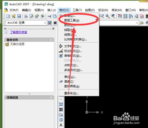 在AutoCAD【格局】下拉菜单中选择【图层东西】并点击打开
