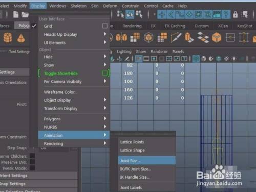 9、若感觉骨骼太小可调节显示骨骼大小来调节:display----animation---joint size