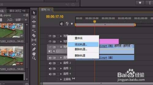 打开premiere软件,然后在正常轨道上,点击鼠标右键,选择“添加轨道”