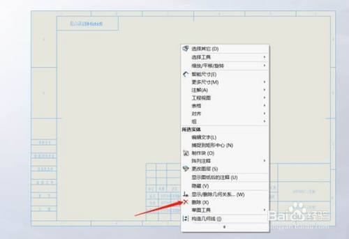 在进行新的工程图模板建造之前,我们可以先把旧模板的题目栏和图框框选然后右键删除。