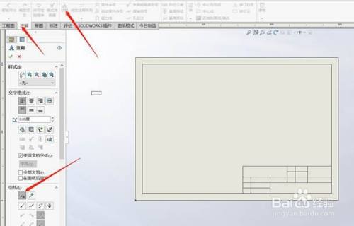 在题目栏中添加文字,在东西栏中选择注解>注释。在注释属性中引线栏选择无引线。然后添加题目栏中的文字。