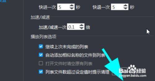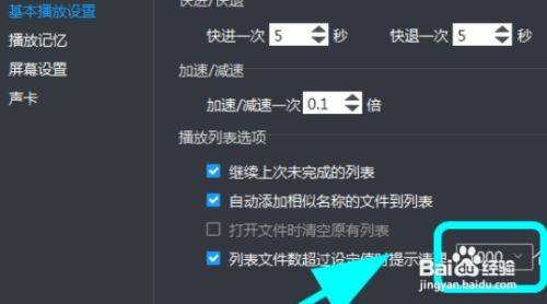 5、进入根基播放设置,点击列表文件数跨越设定值则提醒清理后边的数值选择框,下拉框出来后,点击选中具体数值,例如500;