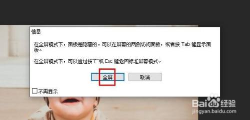 要完全最大化您的工作区域,请切换到 Photoshop 三种屏幕模式中全屏模式。选择全屏模式 将弹出一个对话框,诠释全屏模式如何工作的根本常识。单击不再显示复选框。然后,单击全屏按钮。