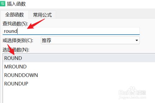 在弹出的“插入函数”对话框中,输入要查找的函数“ROUND”,在搜刮成果中选中“ROUND”,并点击“确定”。