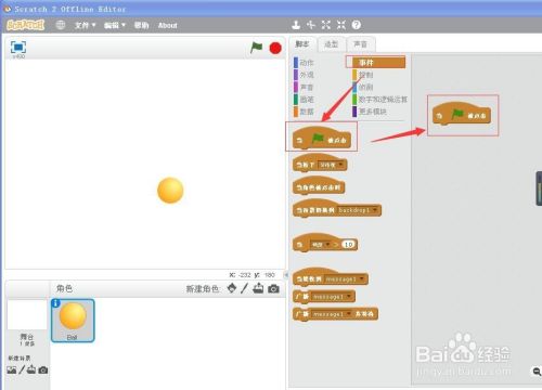 选择事务,将”当绿旗被点击“拉到右边的剧本编纂区放下;
