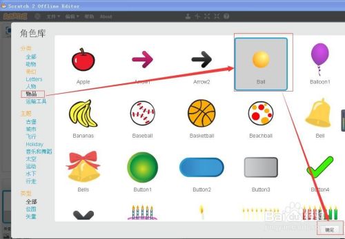 在左边脚色库中选择物品,选择球“Ball“,然后按确定;