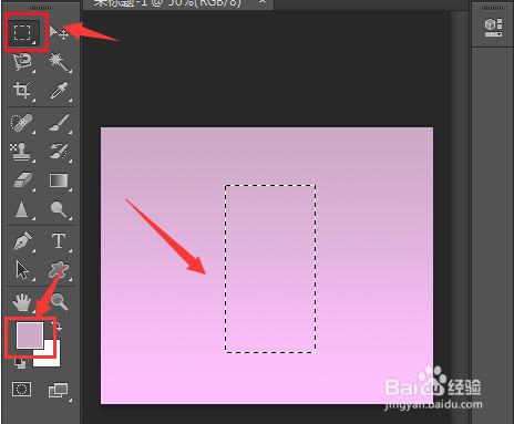 1.打开界面为画布填充粉色布景,点击矩形选框东西绘制长方形