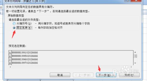 在“步调1”选择“固定宽度”,点击“下一步”按钮