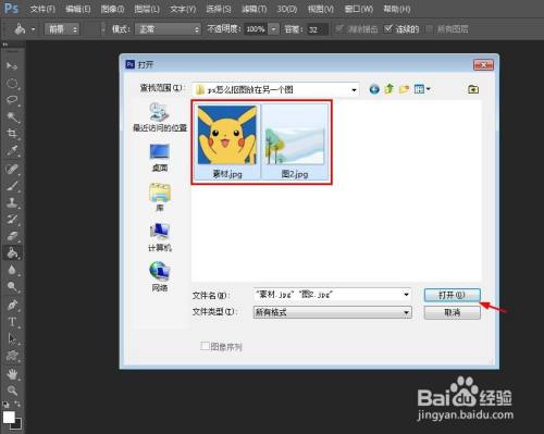 第一步:在ps软件中,利用快捷键Ctrl+O键,在弹出的对话框中,按住Ctrl键,同时选中两张图片,单击“打开”按钮。