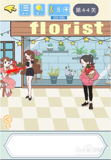 工具/原料小新13window10方式/步骤1首先点击打开男本家儿的背包2然后拿到背包里面的100块钱3随后切换到左边的场景将一百块钱交给办事员4之后将找零的十块钱交给卖花的姑娘5接着点击拿走姑娘手中的玫瑰花6然后将玫瑰花交给女伴侣7最后将绿茶女移动到左边即可END