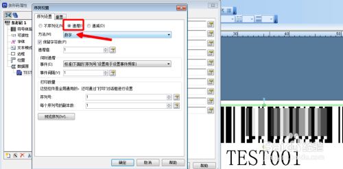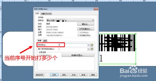 再点击【打印】按钮(或者按Ctrl+P快捷键)调出打印界面,点击【数目】——【序列号】,填写当前要打印的条码数目,