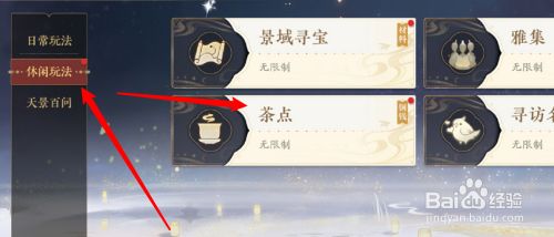 点击左侧的【休闲弄法】,再点击右侧的【茶点】