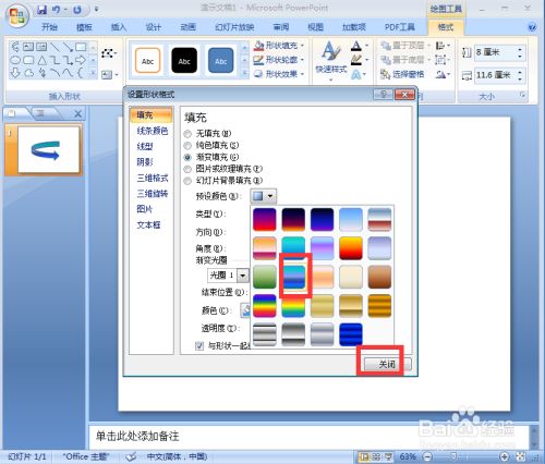 点击格局,找到外形填充,选择渐变下的其他渐变;