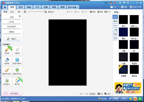 3、点开美化图片之后若是您已经在电脑里有了一张纯黑色的图片,那么您直接按照红色箭头打开一张图片,如果您的电脑里事先没有的话可以按照蓝色箭头点击那个叉叉好,我们需要本身建造一张纯黑色底图,下面我先教如何做黑色底图。