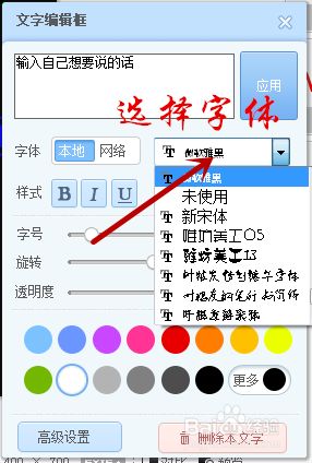 7、点击输入文字后会呈现图2的样子,我们在框内输入文字后可以点窜字体,如下图,选择好了之后应用。之后鼠标右键,点击全数归并。
