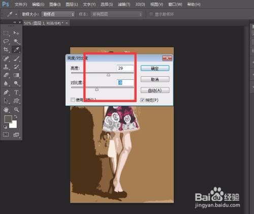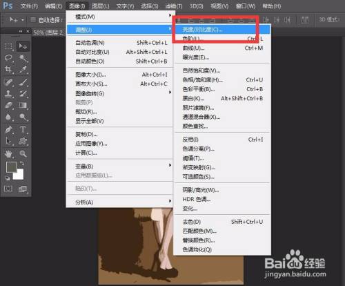 点击确定,我们回到photoshop面板,点击菜单栏的【图像】——【调整】——【亮度/对比度】。