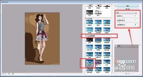 在【滤镜库】中,我们找到【艺术结果】——【木刻】,如下图所示,微调木刻结果的参数,就可以获得艺术化的图片。