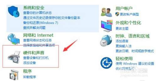 2、在节制面板中打开“硬件和声音”。