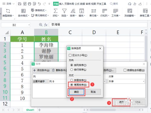 我们把排序选项的体例设置为【笔画排序】,点击【确定】。